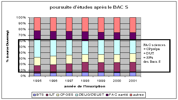 Ce constat est largement à tempérer, car ces évolutions peuvent aussi s'interpréter comme l'effet d'une préférence aux études jugées plus professionnalisantes. Ainsi, DUT, BTS et classes préparatoires scientifiques ne subissent pas le même effet et au total, et au final, comme le montre la figure 1 c'est un ratio quasiment stable (de 1995 à 2001) de 55 bacheliers scientifiques sur 100 qui poursuivent des études scientifiques ou technologiques.