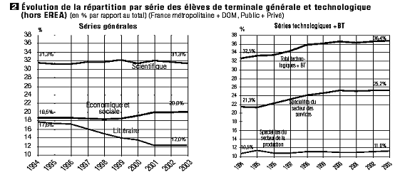 Quant à la baisse des baccalauréats scientifiques, elle doit être également pondérée : certes, le nombre de Bac S est passé de 139 à 129 milliers sur a période 1995-2002 (soit - 6,5%) ; mais il faut avoir en tête que sur la même période 1995-2002, les bac littéraires sont passés de 71 milles à 50 milles (soit -30%) et les Bac pro de 67 à 93,5 milles (soit +40%), les Bacc sciences éco et techno ayant eux peu variés (Bac ES en légère croissance de 76,5 à 79 milles et Bac techno à l'équilibre ayant passé de 138 à 141 milliers avec un max en 152 milles en 2000) [5].