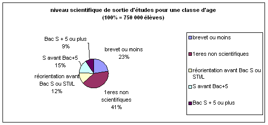 Quant à la baisse des baccalauréats scientifiques, elle doit être également pondérée : certes, le nombre de Bac S est passé de 139 à 129 milles sur a période 1995-2002(soit - 6,5%) ; mais il faut avoir en tête que sur la même période 1995-2002, les bac littéraires sont passés de 71 milles à 50 milles (soit -30%) et les Bac pro de 67 à 93,5 milles (soit +40%), les Bacc sciences éco et techno ayant eux peu variés (Bac ES en légère croissance de 76,5 à 79 milles et Bac techno à l'équilibre ayant passé de 138 à 141 milles avec un max en 152 milles en 2000) [sources : DEP MEJENR, rapports Ourisson et Duverney].